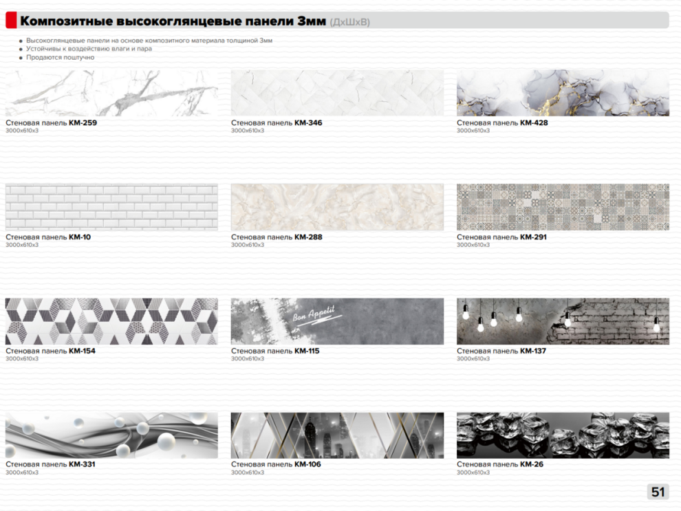 Стеновая панель композитная высокоглянцевая 3000х610х3 Декоры: КМ-259, КМ-346, КМ-428, КМ-10, КМ-288, КМ-291, КМ-154, КМ-115, КМ-137, КМ-331, КМ-106, КМ-265600